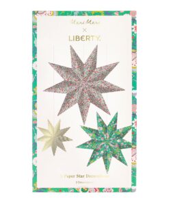 Part of Meri-Meri’s collaboration with Liberty, these statement Christmas star decorations have it all – colour, style, and sophistication! The Liberty floral print designs team beautifully with luxurious pink velvet ribbons and pale matte gold foil details. Perfect for hanging in a porch or window, or from the ceiling, for a vibrant look. Hang them together or place them separately to achieve the effect you want. Reusable, bring them out every year for seasonal cheer and elegance. Driven by discovery, Liberty has been home to the artistic shopper since 1875. Famed for its directional design and celebration of craftsmanship, its prints are created in the heart of London by the Liberty design studio.
