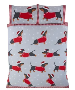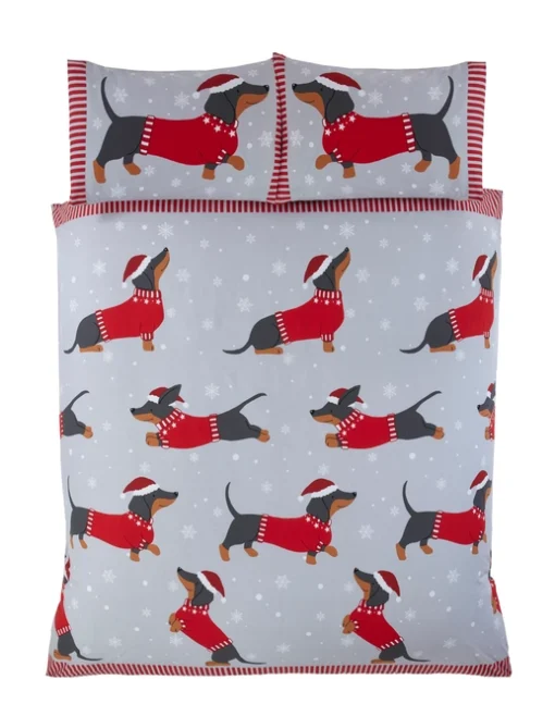 Dachshund Through The Snow Duvet Set: Get into the christmas spirit with this adorable novelty design. Featuring the cute daschund sausage dog, wearing woolly jumpers and santa hats, against a soft grey background of falling snowflakes.