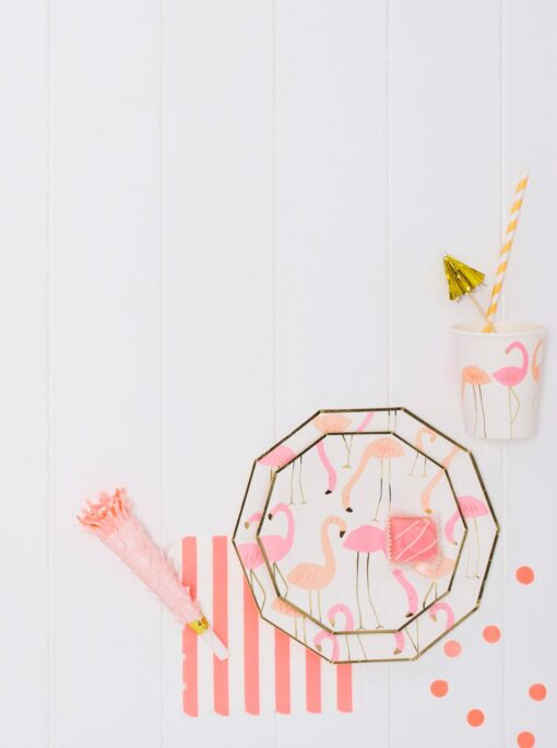 Gorgeous, fancy flamingo print paper cup set by Meri-Meri. We adore this elegant flamingo printed party set by Meri-Meri. The gorgeous pinks and coral with gold foil details and the elegance of the flamingos. This flamingo print party range is suitable for little ones parties and for grown up’s too!