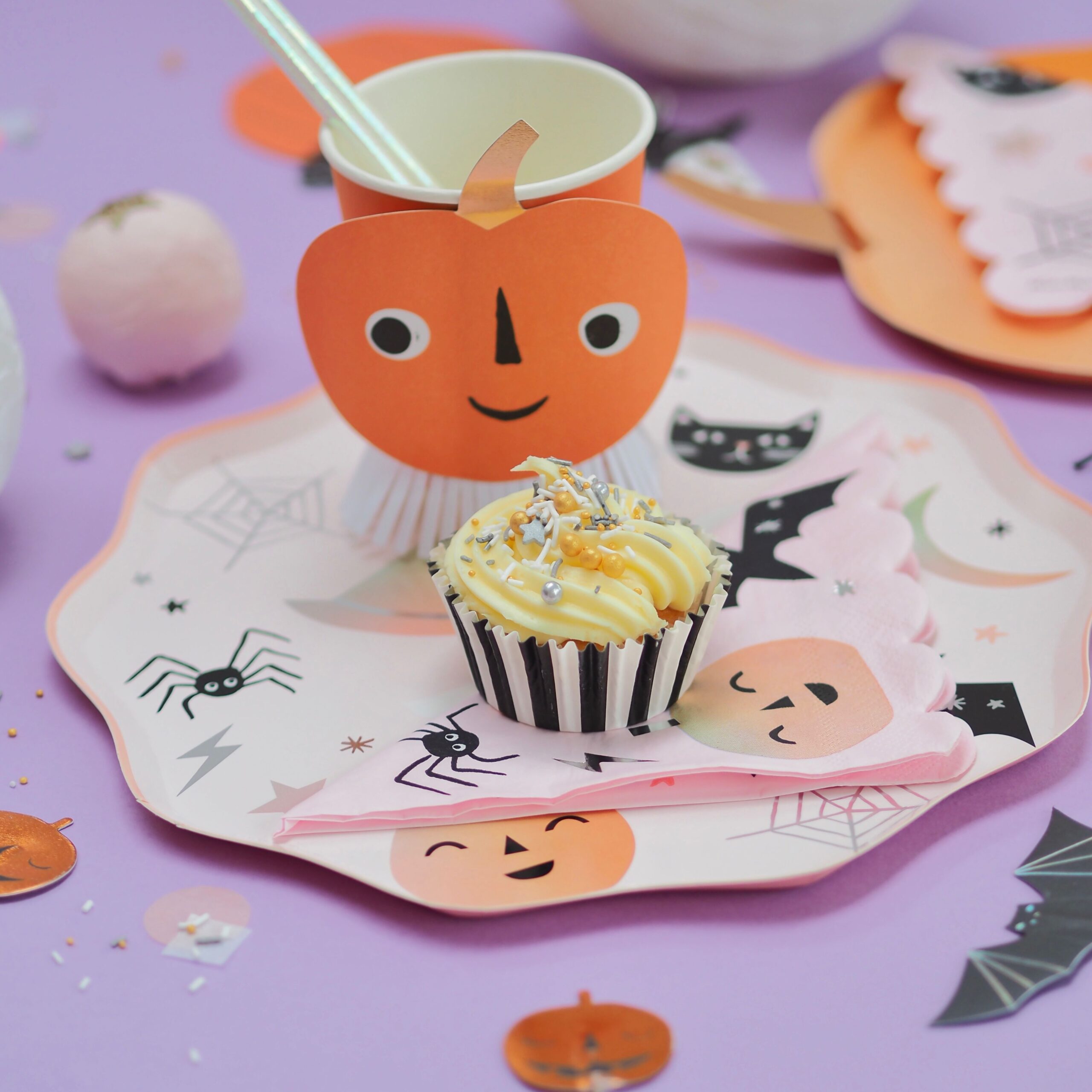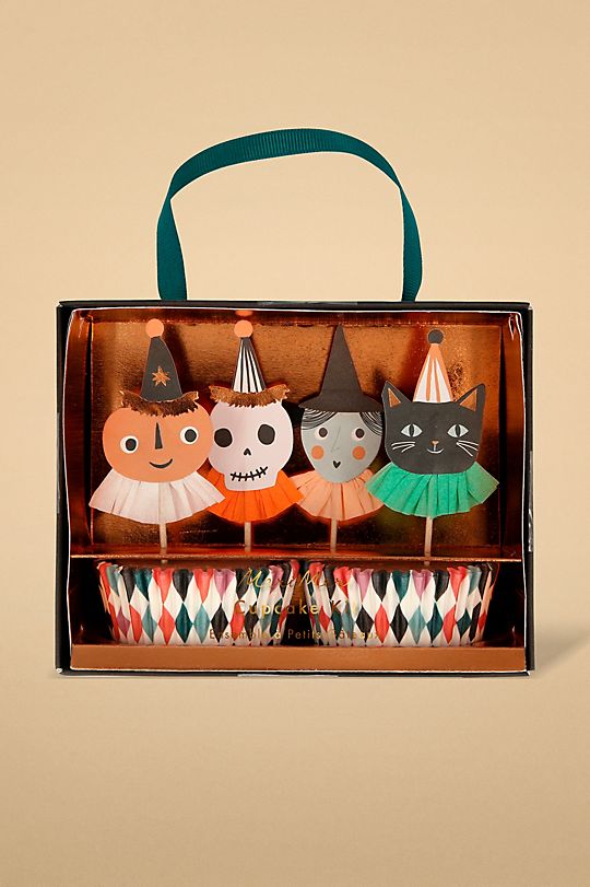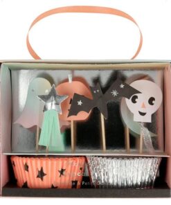 Make the most terrific cupcakes with this very special Halloween kit. It includes 24 toppers in 4 delightful designs, including a black cat, skeleton, witch and pumpkin. The kit also features 24 cases, made from greaseproof paper with a colourful harlequin design.