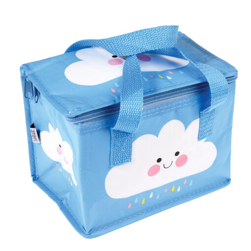 Cute Happy Cloud print insulated lunch bag. This super cute lunch bag is made from recycled plastic bottles and foil insulated to keep food fresh. We have matching drinks bottles and lunch boxes in this design too.