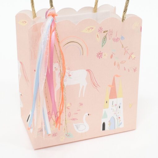 Beautiful Princess Print Party Bags, by Meri-Meri. Little princesses and princes will be sad the party is over, but delighted to leave with one of these beautiful bags which you’ve filled with treats. They feature unicorns, castles and swans with a gorgeous tassel, scalloped edge and gold handle.