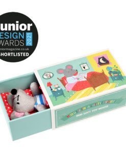 An adorable miniature mouse soft toy. The mouse comes with their own removable stripy top and is tucked up in a cosy polka dot blanket. All packaged in a lovely illustrated matchbox style gift box.