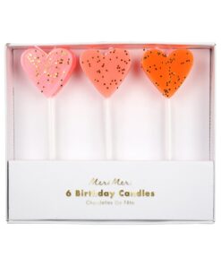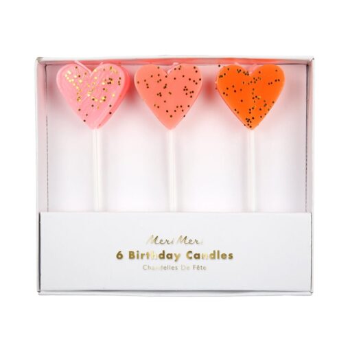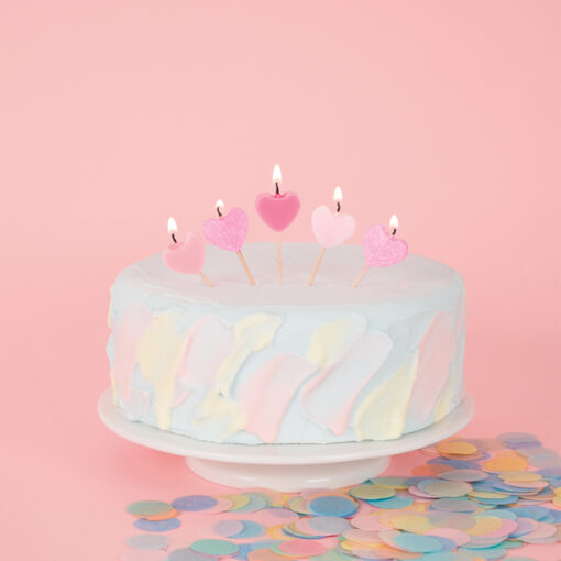 HEART CANDLES IN PASTEL COLOURS, EMBELLISHED WITH SHINY GOLD FOIL FLECKS.