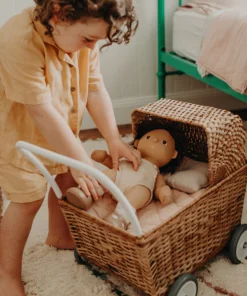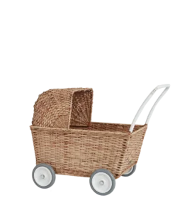 Strolley is a revolutionary design in imaginative play. This hand-woven rattan basket on wheels switches from a pram to a shopping trolley, by just lowering the hood of the pram.