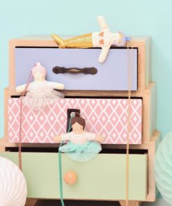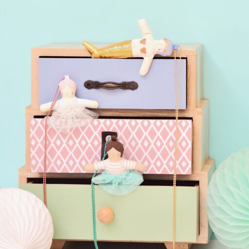 An adorable doll on a necklace is a really special gift indeed! Featuring Ruby, beautifully crafted from cotton, with a twisted yarn hair braid and a pretty peach tulle skirt. The bead chain is a stunning shade of blue.