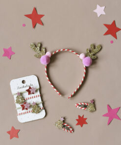 The jolliest headband to add a little festive fun to your Christmas! These chunky gold glitter reindeer ears are adorned with bright pink pom poms on each side. They are set securely onto a red and cream striped fabric-covered band, which is designed to provide a comfortable fit for little heads.