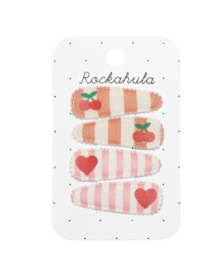 Sweet cherries adorn these striped grosgrain ribbon wrapped snap clips! Each cherry has detailed green stems and delicious red pompom fruits. Take a peek at the rest of the super sweet cherry collection including headbands, sunglasses & jewellery boxes.