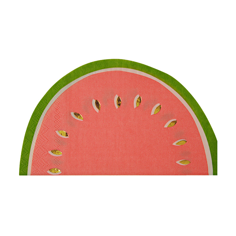 Fab bright orange water melon shaped napkins. This set of colorful party napkins are in the shape of a slice of water melon, they are brightly coloured and finished with gold foil. They are gorgeous!