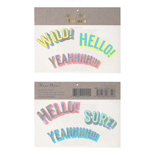 Fab slogan tattoo pack by Meri-Meri. These cool tattoos come with crazy slogans in bright colours, embellished with iridescent foil. Wild, Hello & Yeah slogans. These temporary tattoos are perfect for parties and party bags.