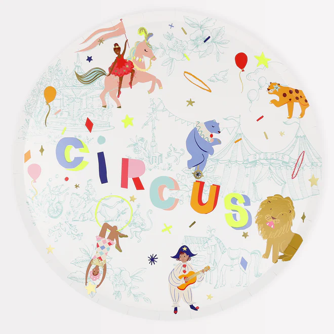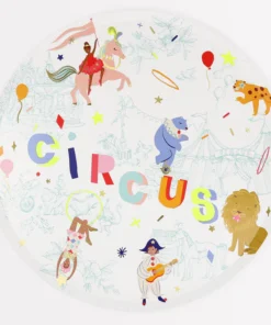 Roll up, roll up for all the fun of a circus party! These very special dinner plates incorporate a traditional toile circus pattern overlaid with fun graphics and illustrations, making them a fresh, contemporary take on a classic circus theme. Guaranteed to delight your guests.